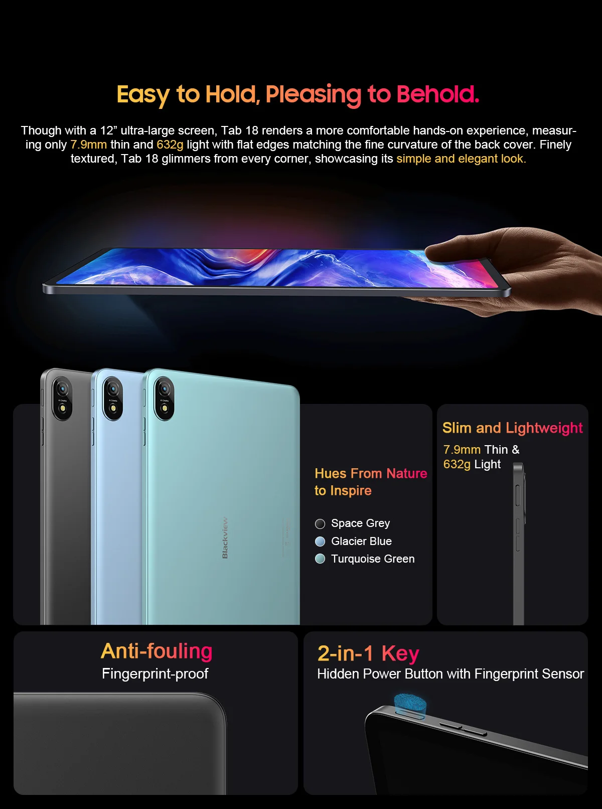 Blackview Tab 18 Tablet PC 12'' 2.4K FHD+Display Helio G99 8GB RAM 256GB ROM, Netflix Widevine L1, 8800mAh Battery 33W