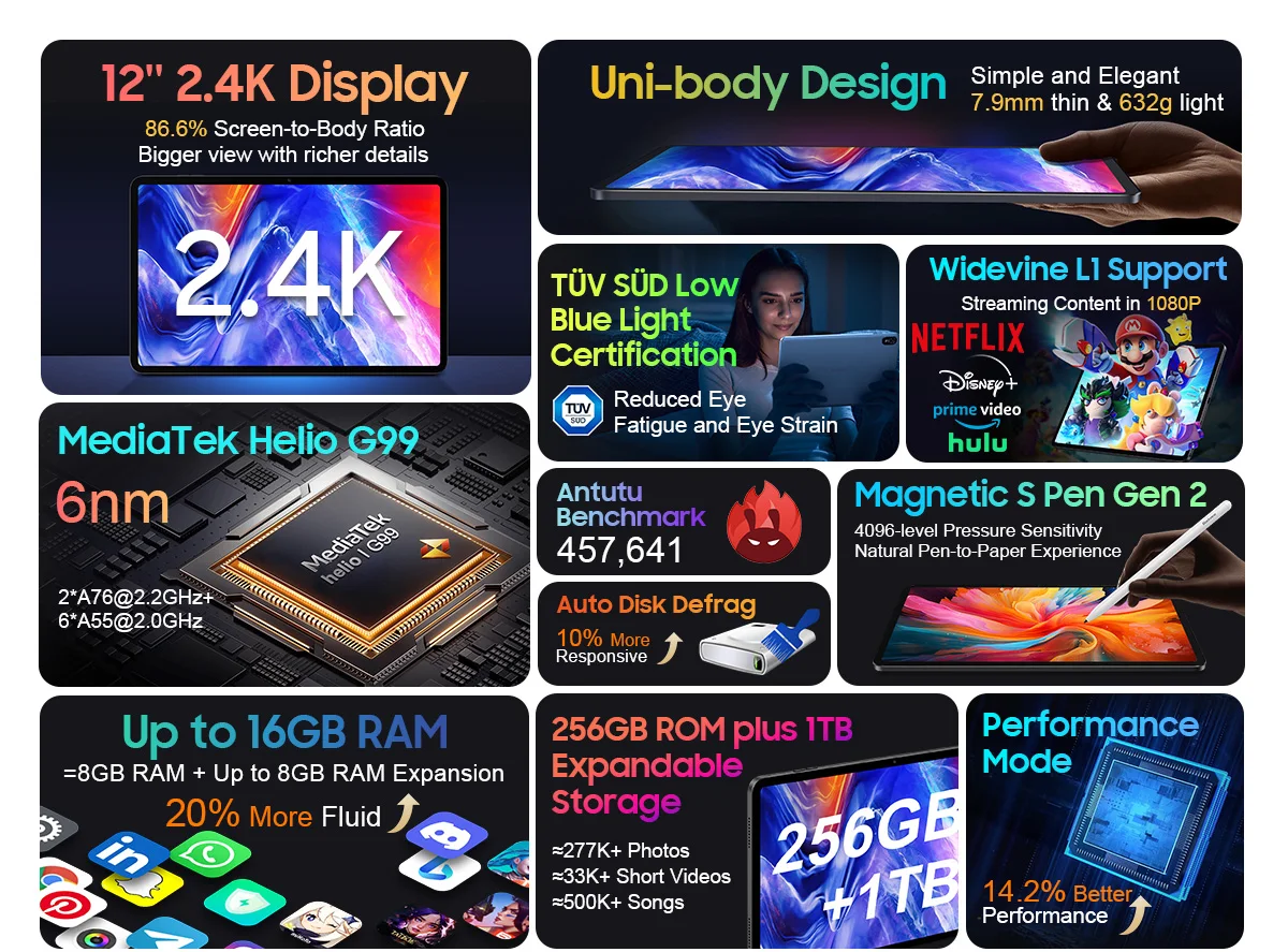 Screen : 12" FHD+ IPS 1200*2000 Display, Widevine L1 Support 1080P