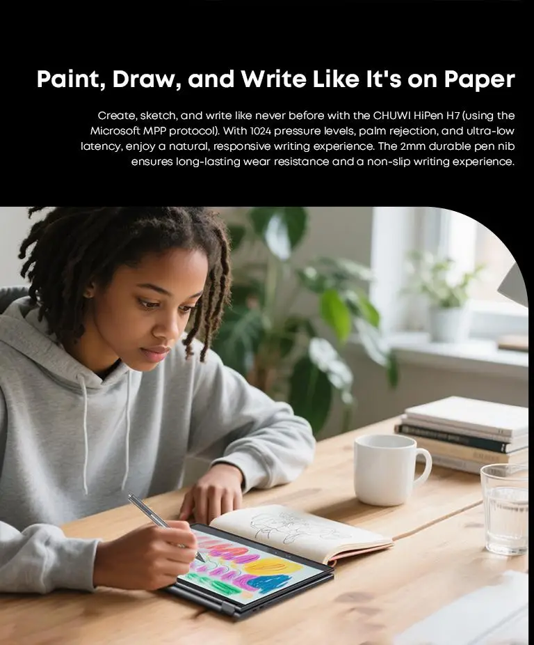Create, sketch, and wrte like never before with the CHUWl HiPen H7 (using theMicrosoft MPP protocol). With 1024 pressure levels, palm rejection, and uitra-lowlatency, enjoy a natural, responsive writing experience. The 2mm durable pen nibensures long-lasting wear resistance and a non-slip writing experience
