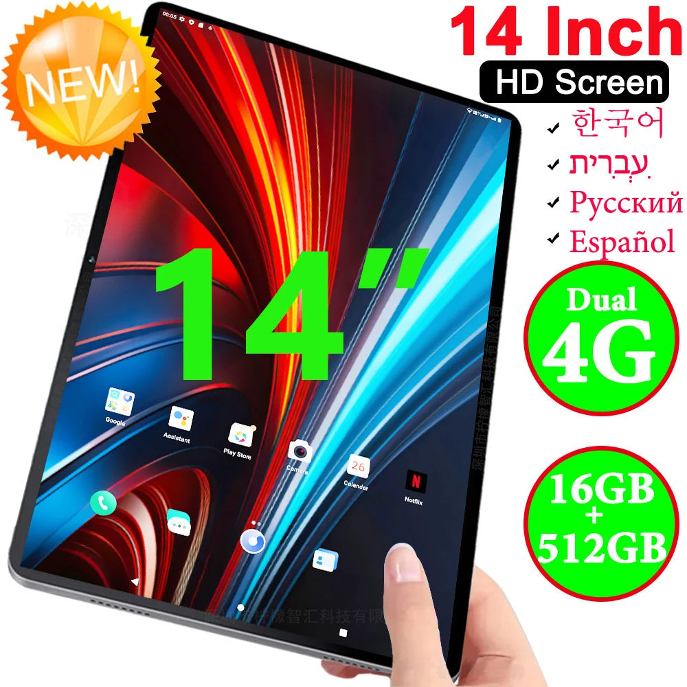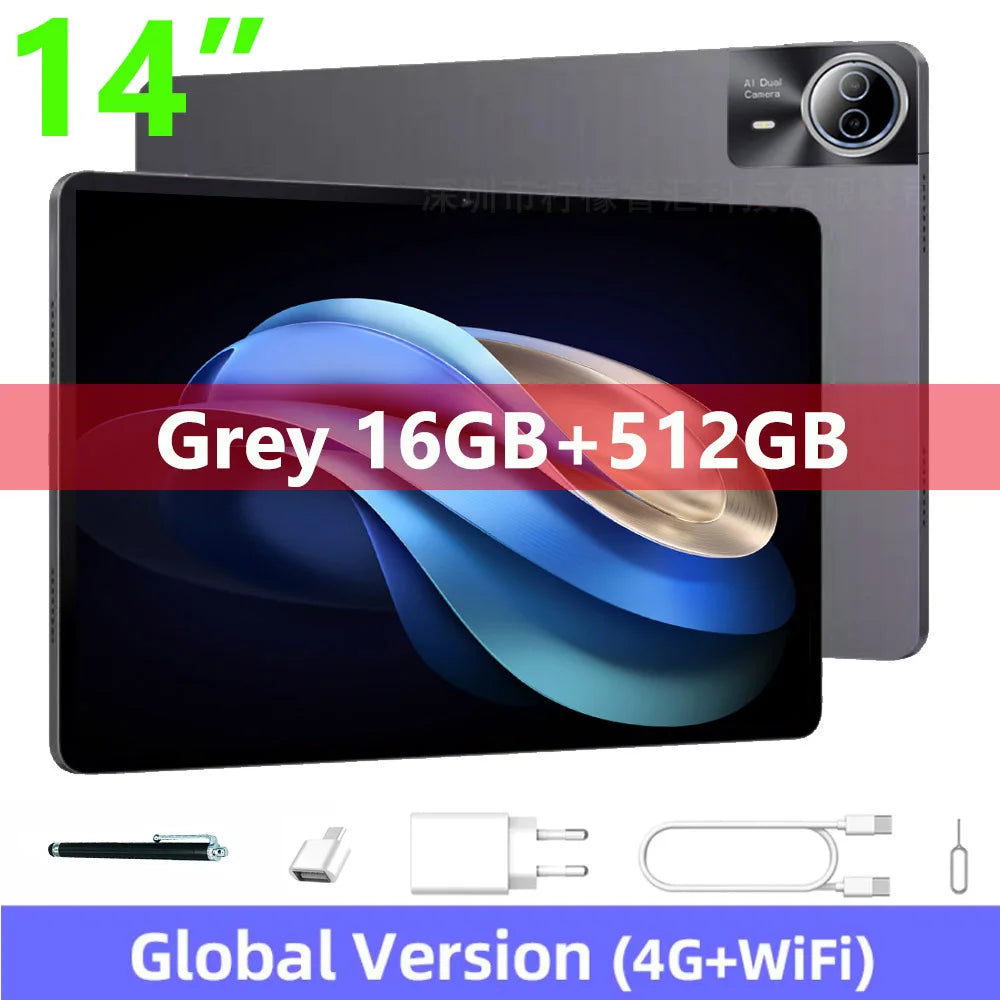 Global Version 14 Inch Tablet PC Big Screen 1920x1200 IPS 16+512GB Tablet 14" Android 14 4G LTE Game Study PAD 12000mAH Battery