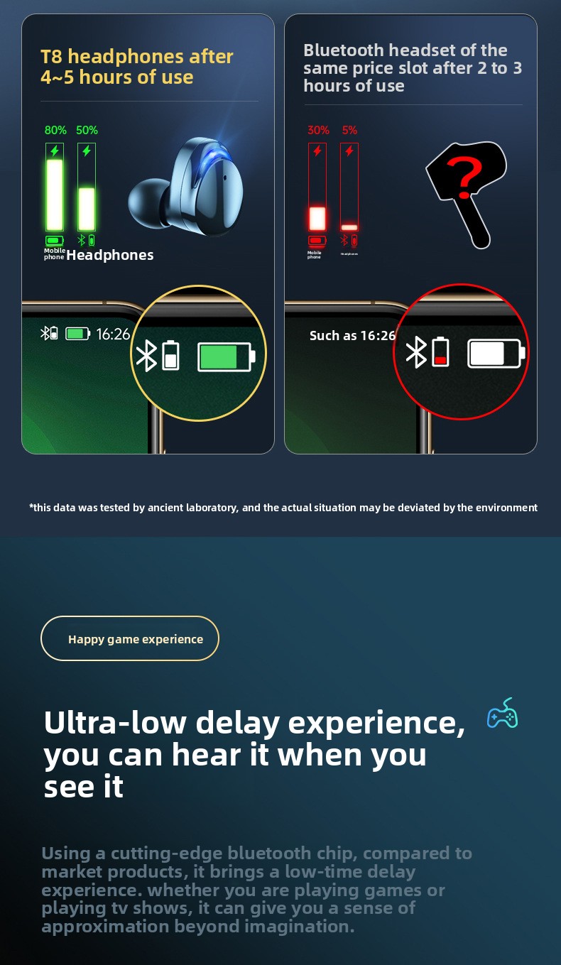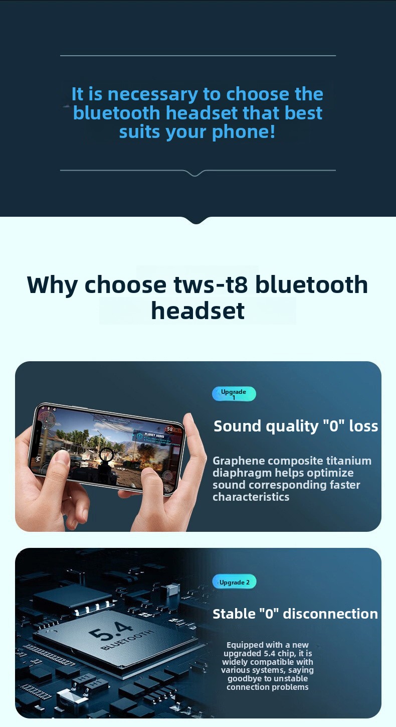 High-Quality Sound: TWS-T8pro offers high-fidelity audio for an immersive listening experience.