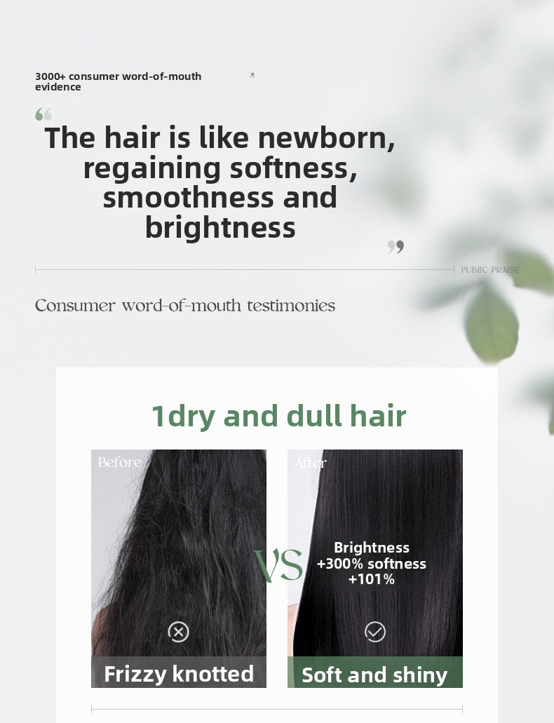 Deep Repair: Specifically formulated to address dryness, breakage and damage caused by perming and dyeing. It can effectively reduce split ends, smooth the hair cuticles, and make the hair soft and shiny.