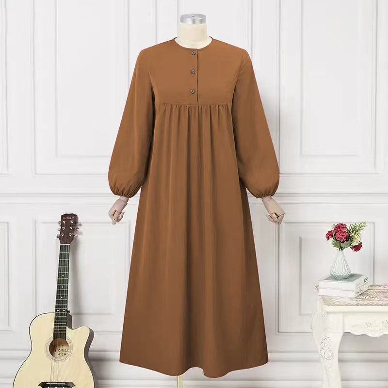 Puff sleeve solid-color buttoned dress