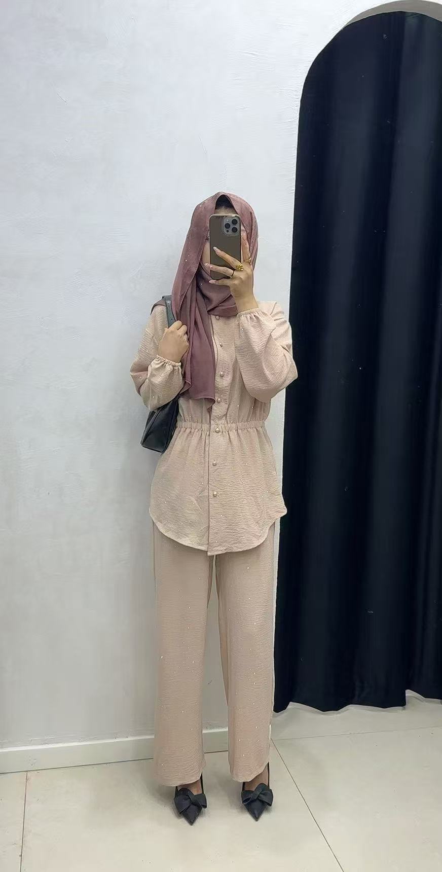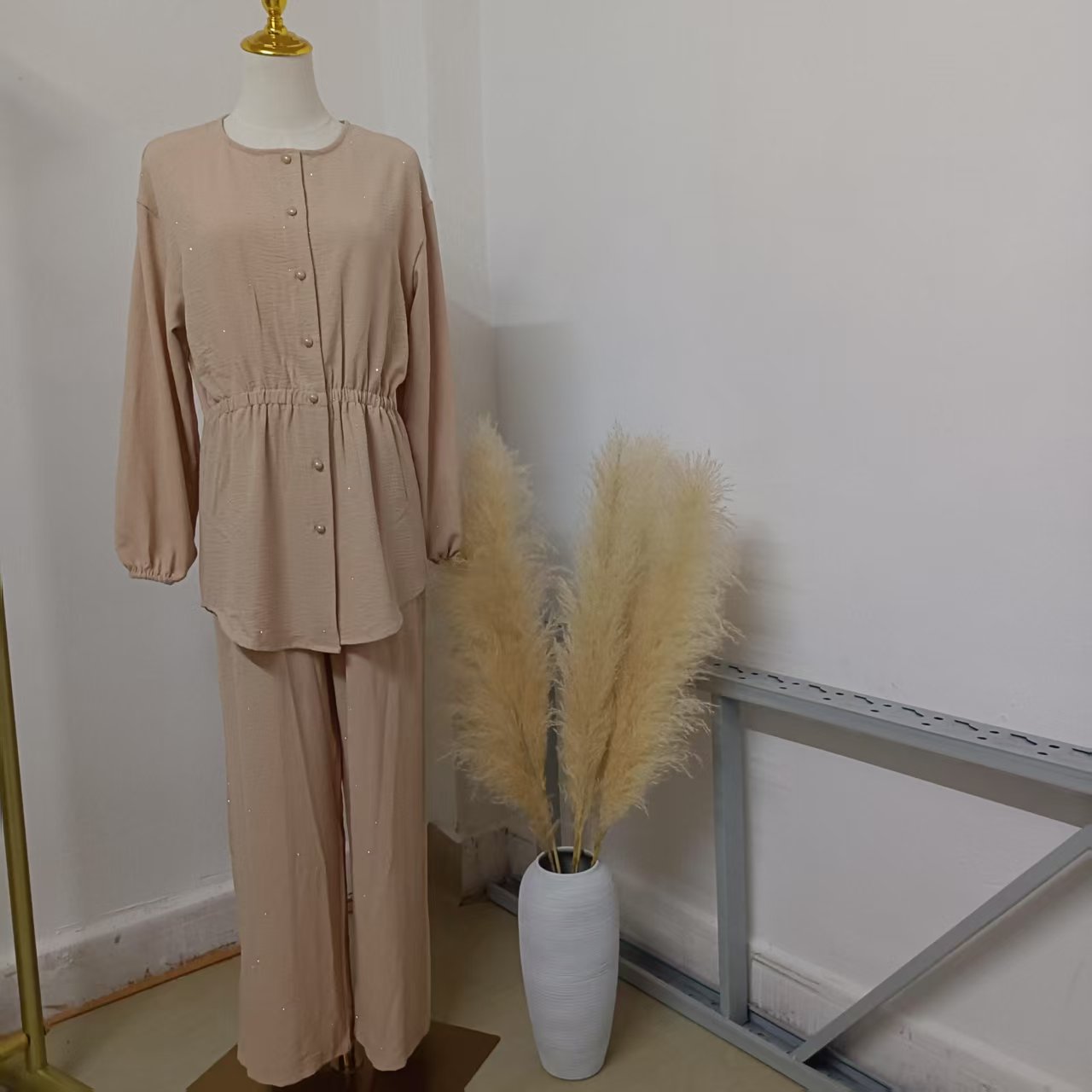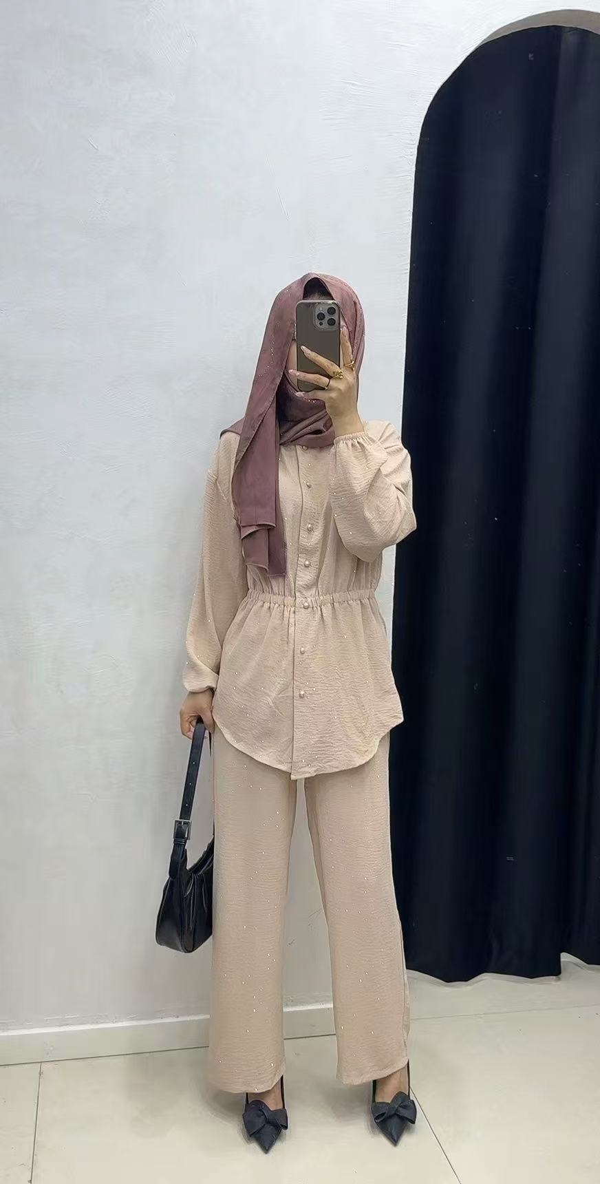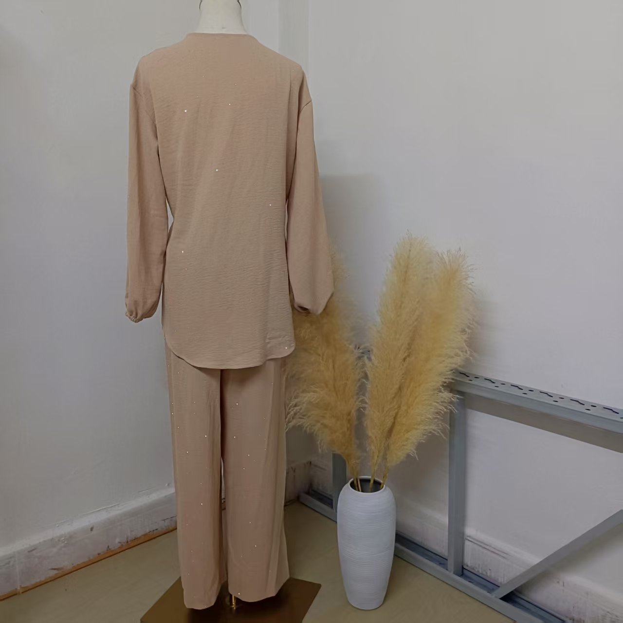 Two-piece set: Includes a shirt top and wide-leg pants for a complete look.