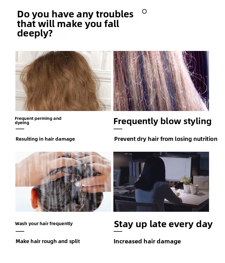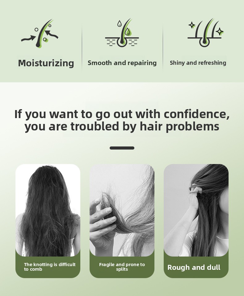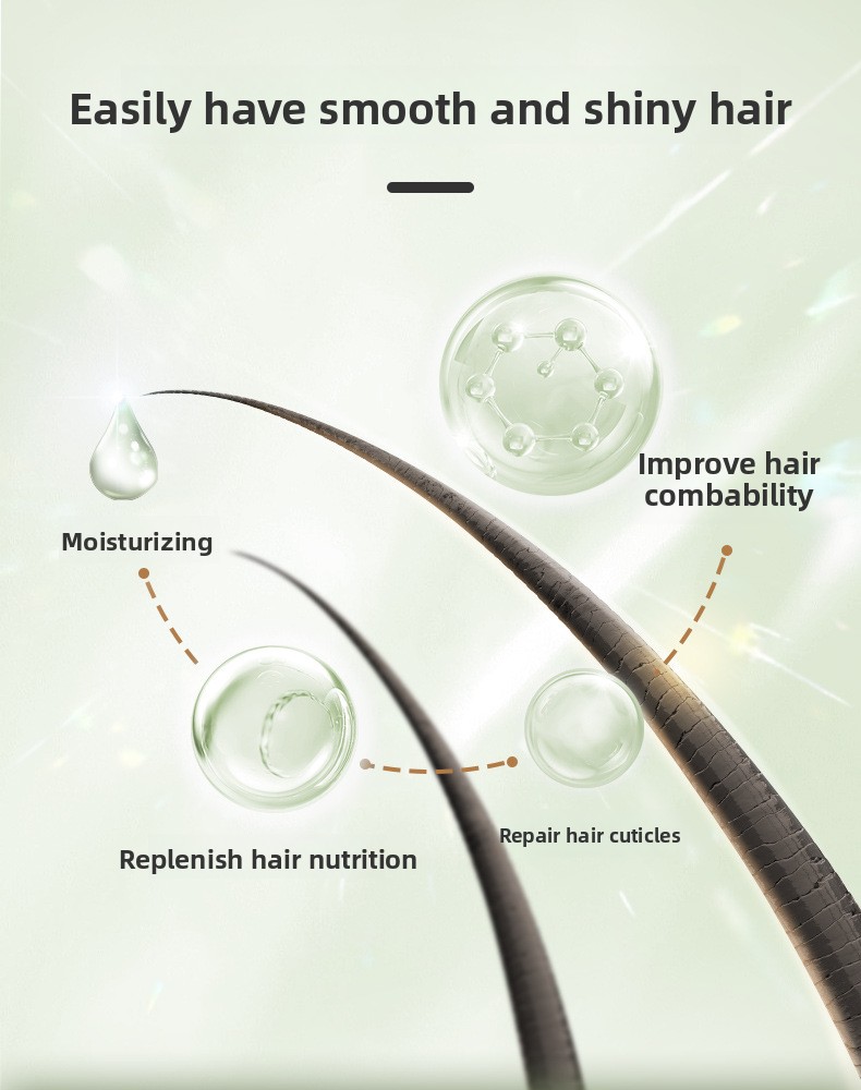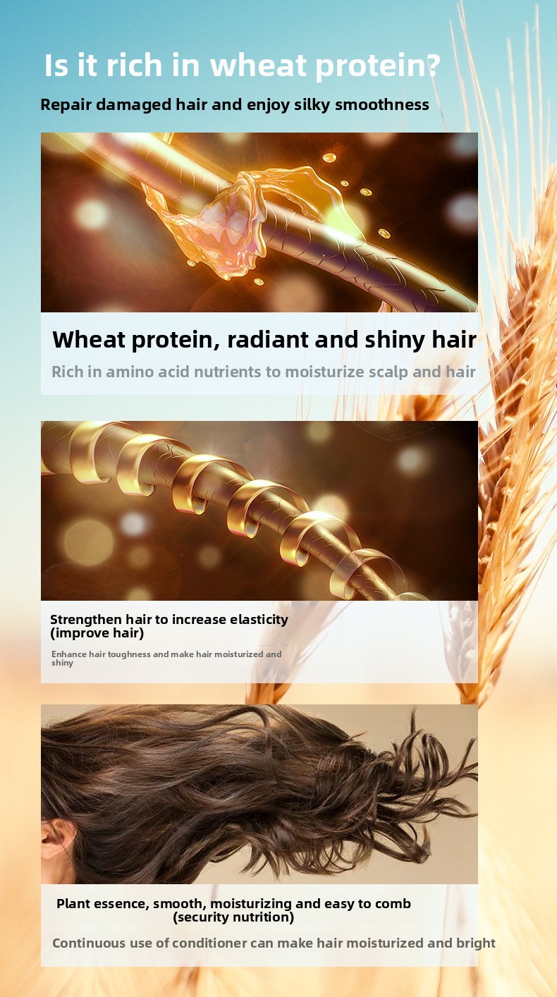 Powerful Ingredient?Rich in wheat protein, a natural plant protein. It can deeply penetrate into the hair shaft, repair damaged cuticles, restore hair elasticity and luster, and enhance hair toughness, reducing breakage and split ends.