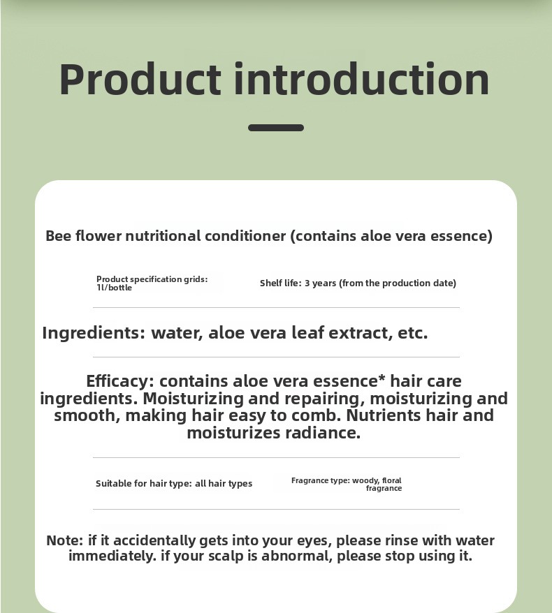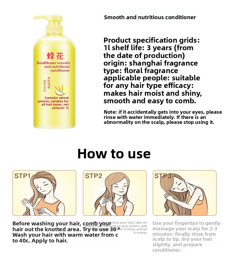 1000ml per bottle (random packaging), containing wheat protein; 1000ml per bottle (random packaging), containing silk peptide essence; 1000ml per bottle (random packaging), containing aloe vera essence; 1000ml per bottle (random packaging), containing sweet almond oil; 1000ml per bottle (random packaging), containing olive essence; 1000ml per bottle (valid until October 2026), containing wheat protein; 500ml per bottle (random packaging), containing wheat protein; 450ml per bottle (random packaging), containing silk peptide essence; 450ml per bottle (random packaging), containing wheat protein; 1000ml per bottle (random packaging), containing chamomile essence; 1000ml per bottle (random packaging), containing rehmannia essence; Softening and nourishing hair conditioner (containing wheat protein) 600ml per bottle