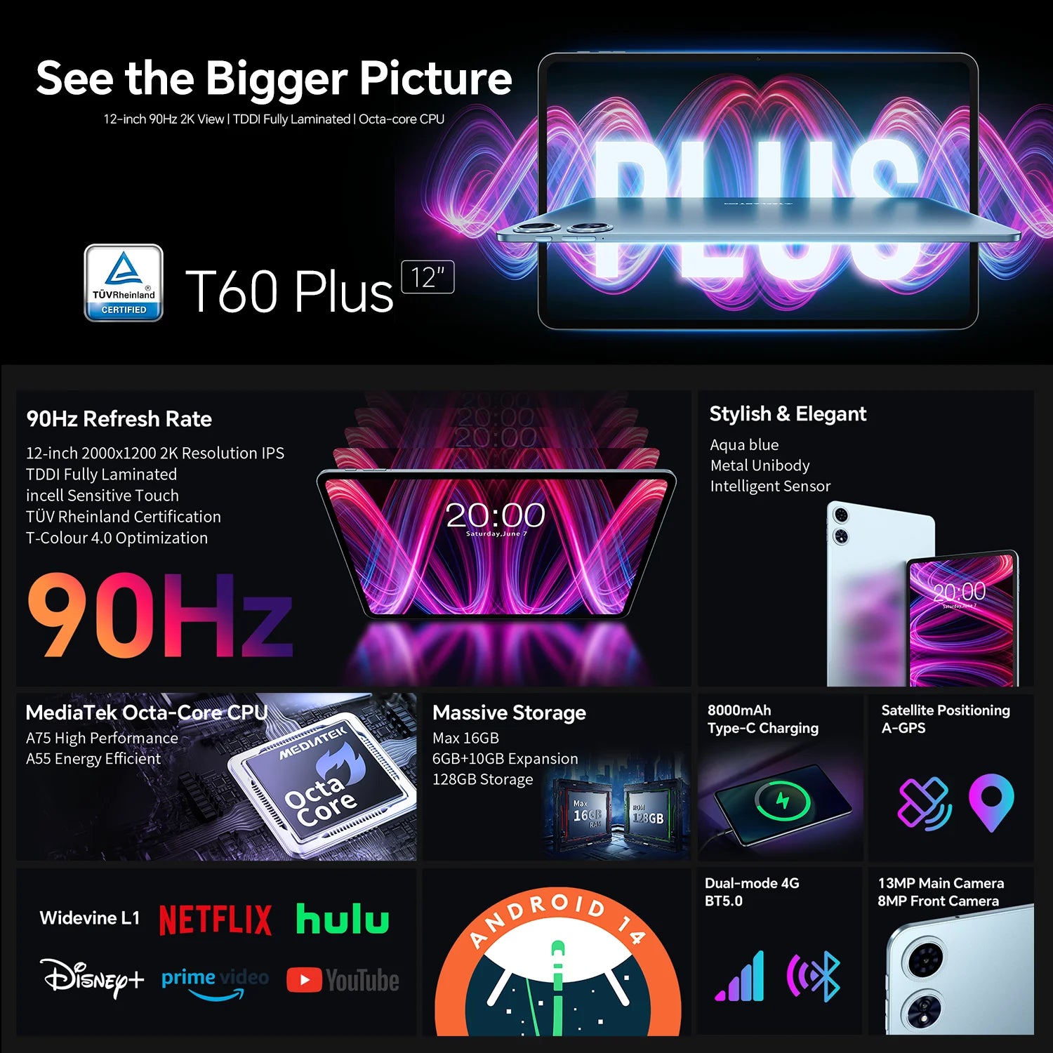 Teclast T60 Plus Tablet 12" 90Hz 2K Display Android 14 MTK G88 Octa-Core Max 16GB RAM 128GB ROM Widevine L1 4G LTE GPS 8000mAh