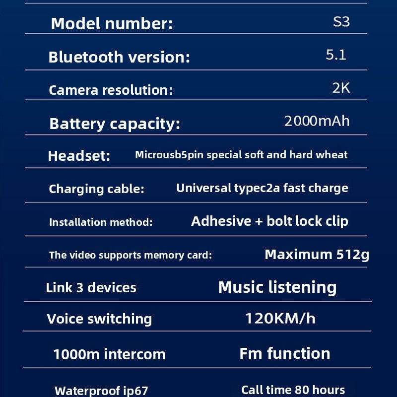 Wireless Motorcycle Helmet Bluetooth Headset with 2K Camera and Intercom